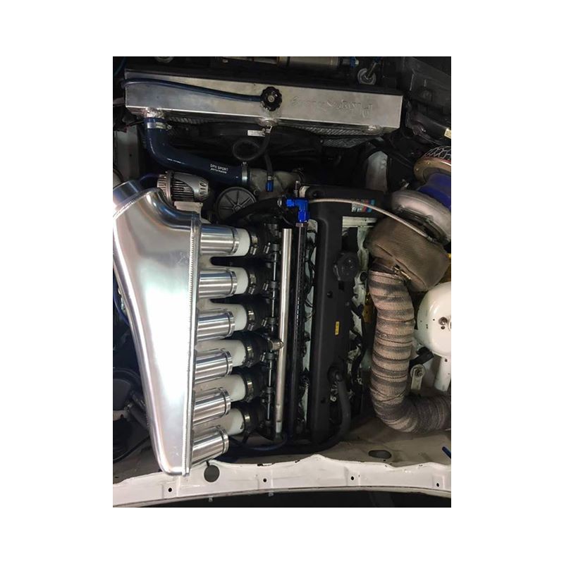 La connexion au filtre à air peut se faire directement (support de radiateur à raccourcir) ou avec une durite coudée pour aller mettre le filtre derrière le phare